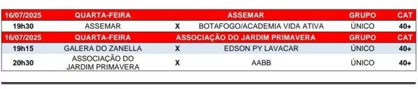 O destaque da rodada fica por conta do confronto direto entre Edson PY Lavacar, líder com seis pontos, e Galera do Zanella, 2º colocado com quatro. O duelo abre a programação no campo do Jardim Primavera, onde os donos da casa enfrentam a AABB na sequência. Já na Assemar, o time mandante recebe o Botafogo/Academia Vida Ativa.