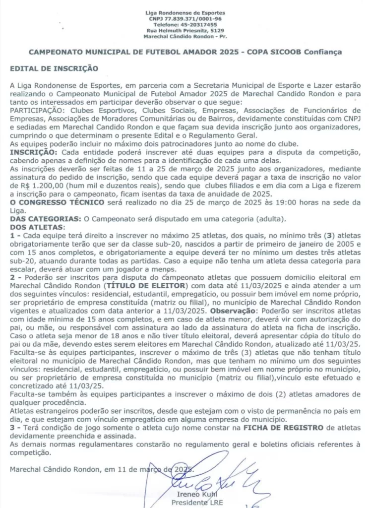 Estão abertas as inscrições para o Campeonato Municipal de Futebol Amador 2025. Na última sexta-feira (14) o presidente da Liga Rondonense de Esportes, Ireneo Kuhl, divulgou o Edital de Inscrição da competição, organizada em parceria com a secretaria de Esporte e Lazer de Marechal Cândido Rondon.