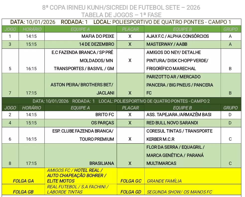 Nesta semana, a organização do torneio divulgou a tabela atualizada da 1ª fase, com os nomes oficiais, com todos os patrocinadores, das 20 equipes que irão representar os municípios de Quatro Pontes, Marechal Rondon, Toledo e Mercedes.