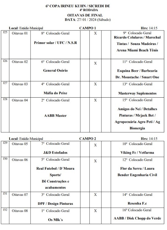 No próximo sábado (27), também no Estádio Municipal de Quatro Pontes, o mata-mata da Copa Irineu Kuhn 2024 terá a seguinte programação: