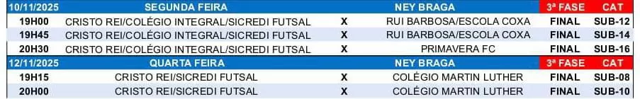 Na preliminar, pela categoria sub-16, o Colégio Rui Barbosa, com gols de Iago e Rhyan, venceu a Escola Coxa/São Lucas FC, que marcou com Lucas, por 2 a 1, de virada.