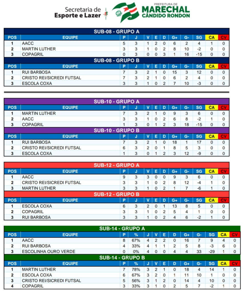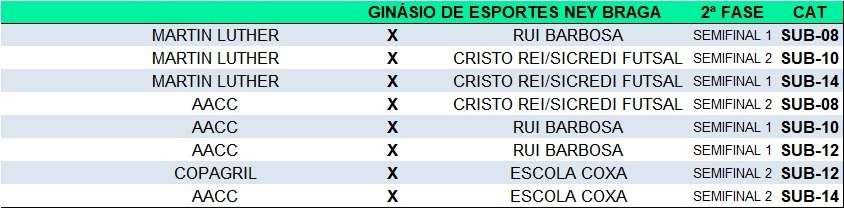 No confronto direto que valia a classificação na categoria sub-14, a Escola Coxa venceu o Rui Barbosa por 2 a 1, de virada. Na primeira etapa, Bernardo Damas colocou os donos da casa em vantagem, mas após o intervalo Lucas marcou duas vezes e garantiu a vaga no Coxa na semifinal.