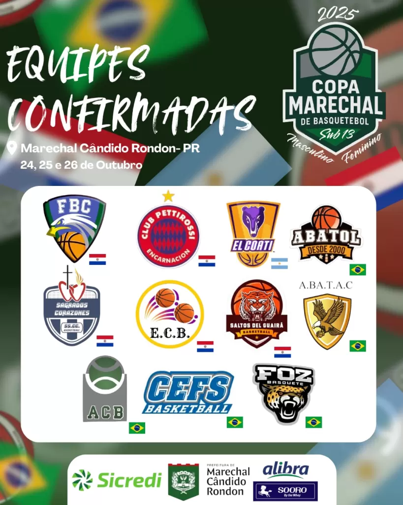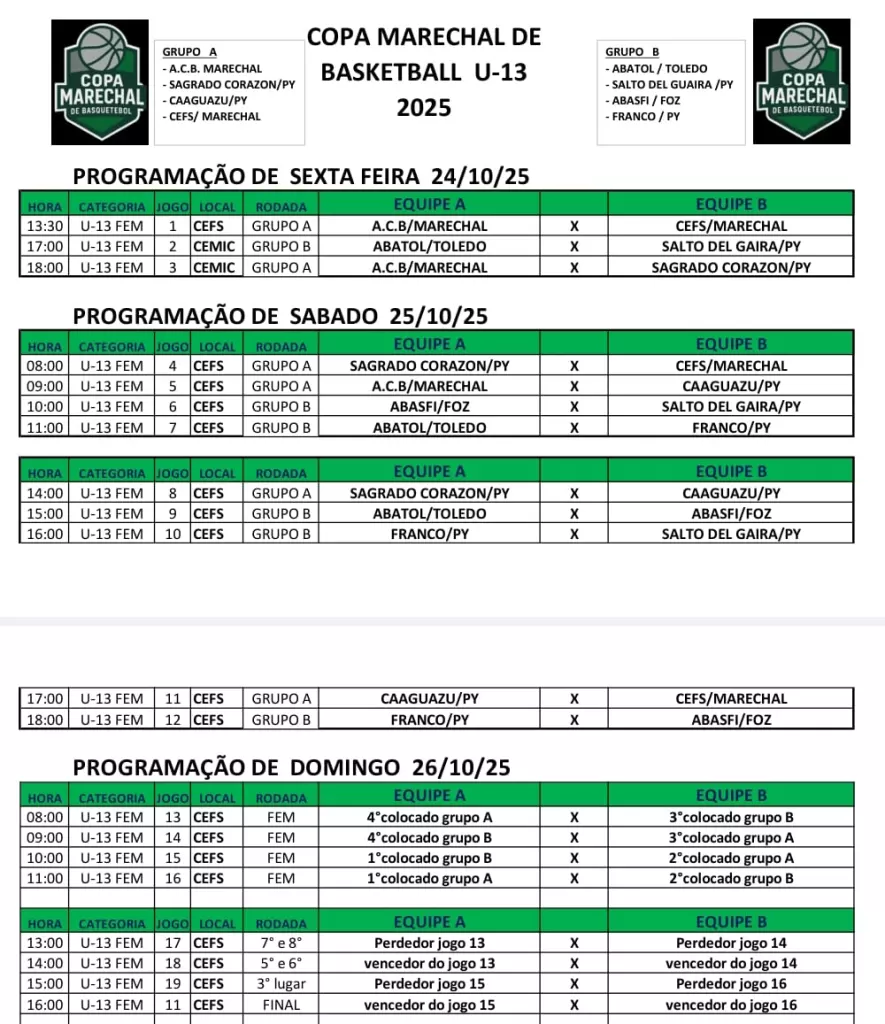 No feminino, com jogos no ginásio do Colégio Frentino Sackser, estarão na disputa a ACB/Prefeitura de Marechal Rondon, CEFS/Marechal Sagrado Corazón/PY e Caaguazú/ PY, no Grupo A, e Abatol/Toledo, Abasfi/ Foz do Iguaçu, Salto del Guairá/PY e Franco/PY, no Grupo B.