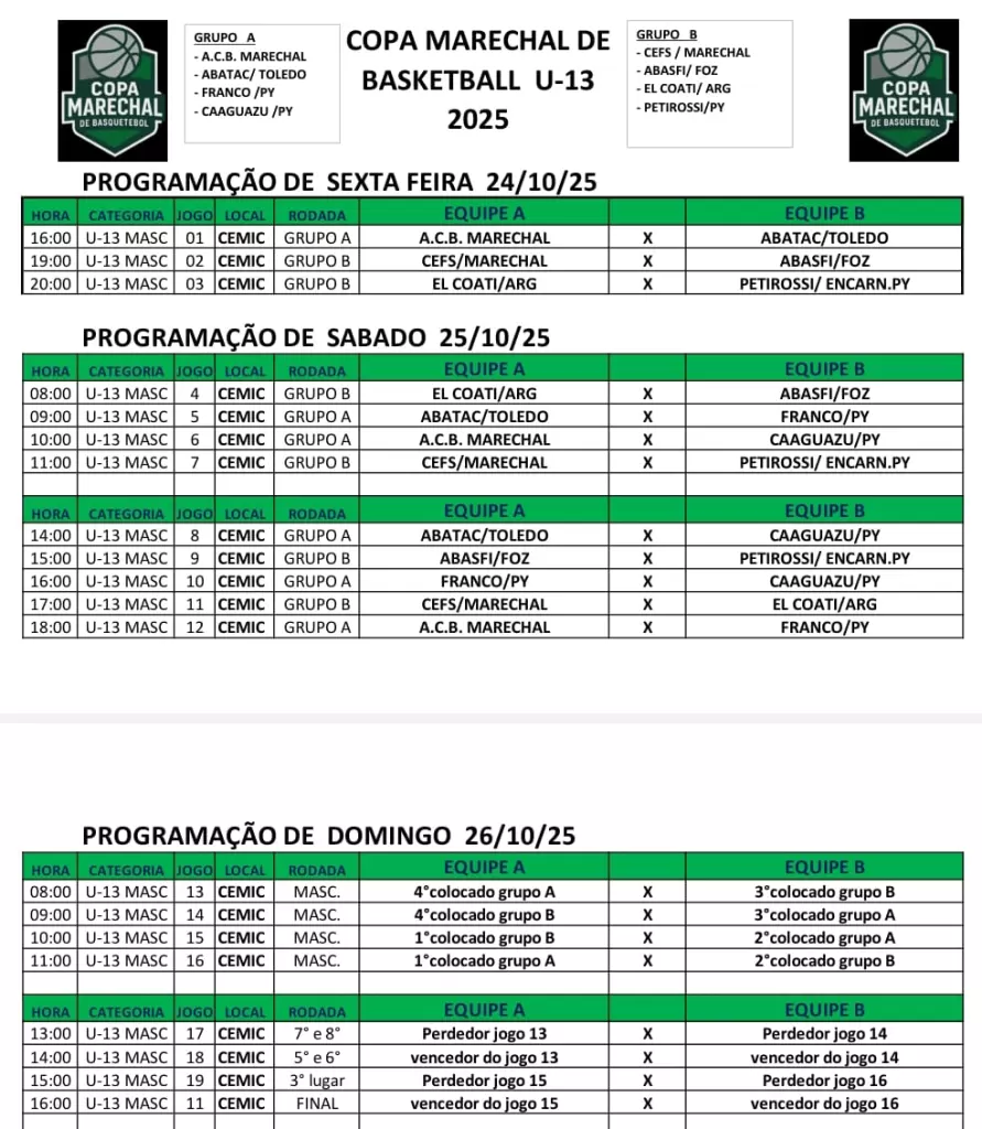 No masculino, que acontecerá no ginásio do CAF (CEMIC), estarão em ação ACB/Prefeitura de Marechal Rondon, Abatac/Toledo, Franco/PY e Caaguazú/PY, no Grupo A, e CEFS/Marechal, Abasfi/Foz, El Coatí/ARG e Petirossi/PY, no Grupo B.