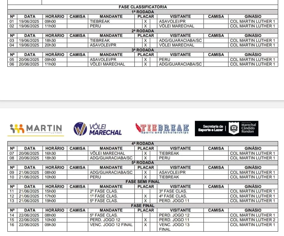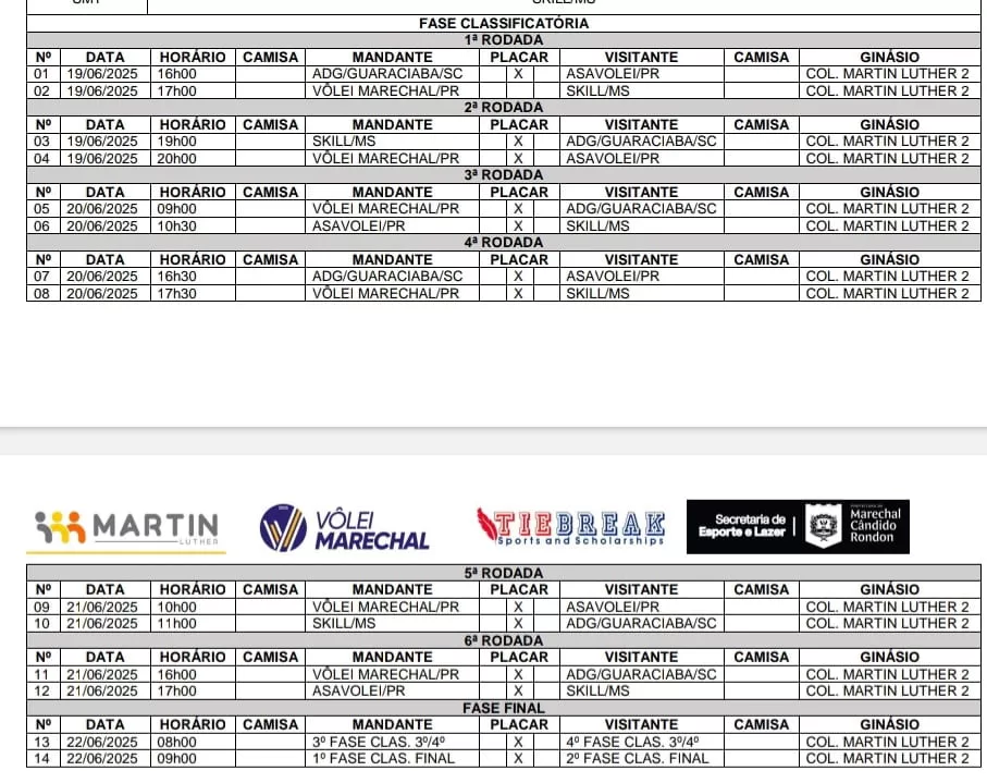 Nas imagens ao lado você confere a programação completa da copa Marechal de Voleibol. Vá ao ginásio do Colégio Martin Luther e prestigie a competição. A entrada é gratuita.