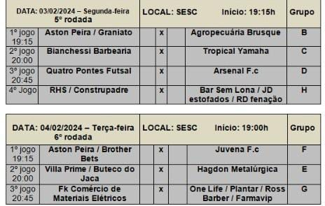 Semana cheia na Copa SESC Verão de Futsal. Entre esta segunda-feira (3) e sexta-feira (7), 18 partidas irão movimentar a fase de classificação do torneio promovido pelo SESC Marechal Cândido Rondon, que reúne 26 times de várias cidades da região.