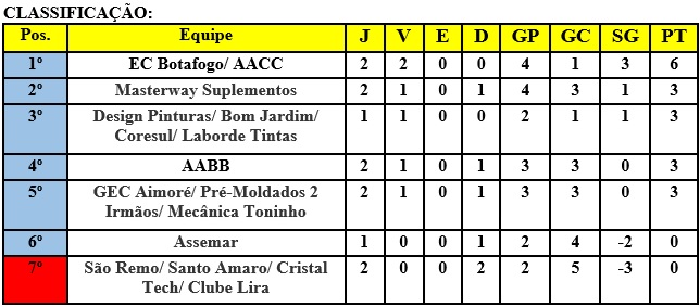 Nesta 3ª rodada, o São Remo/Santo Amaro/Cristal Tech/Clube Lira estará de folga.