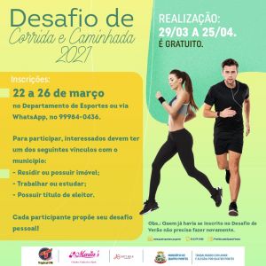 Somente pode participar quem tem algum vínculo com o município, como residir ou possuir imóvel, trabalhar ou estudar ou ter título de eleitor. A participação de menores de 18 anos é de responsabilidade dos pais ou responsáveis. O desafio será realizado no período de 29 de março a 25 de abril, sendo que o participante propõe seu desafio.