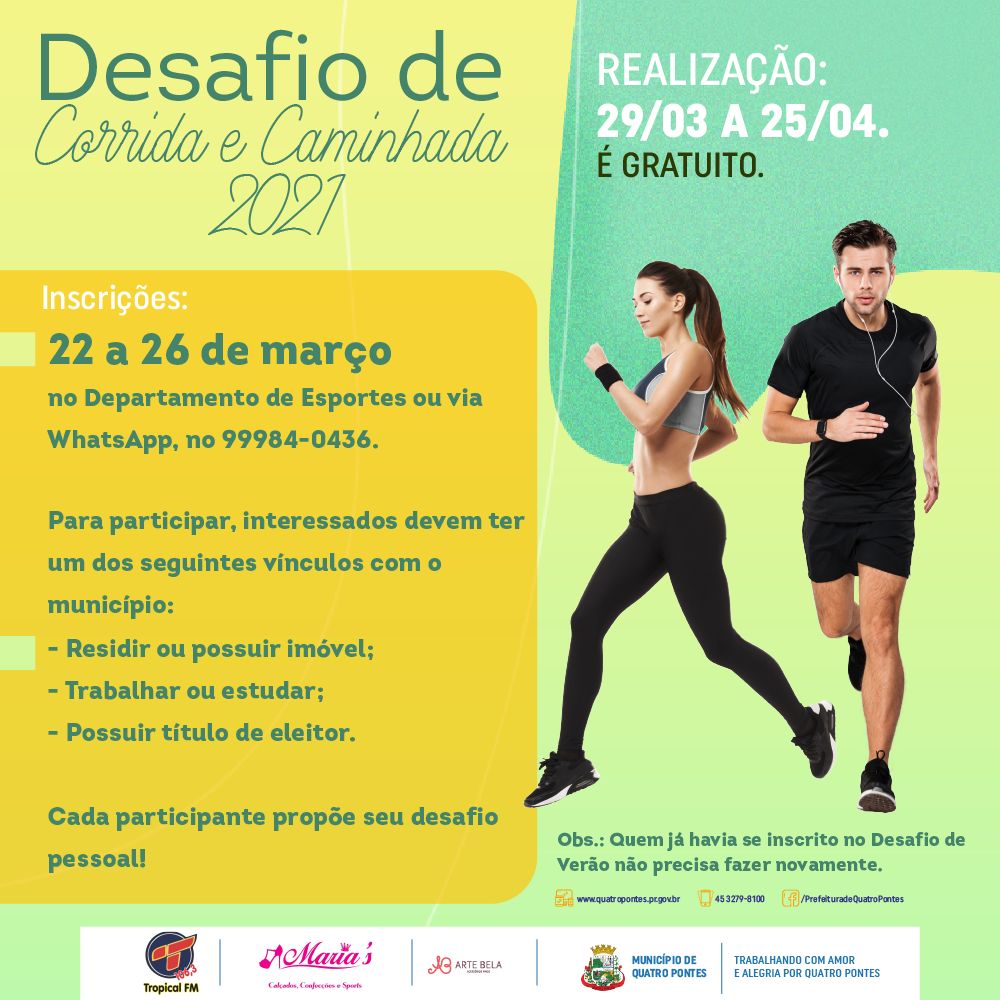 O Departamento de Esportes de Quatro Pontes abriu nesta semana as inscrições ao Desafio de Corrida e Caminhada 2021, encerrando na sexta-feira (26). Para participar basta enviar uma mensagem via WhatsApp no 99984-0436, informando nome e RG, ou procurar o departamento no Centro Poliesportivo Seno José Lang, das 08 ao meio-dia e das 13h30 às 17h30. Quem participou do Desafio de Verão de Corrida e Caminhada 2021 não precisa se inscrever novamente.