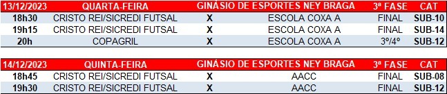 Em seguida, a Copagril ficou com a 3ª posição do sub-10 ao vencer o Colégio Rui Barbosa por 5 a 4. No fechamento da rodada, a AACC levou a melhor no duelo ‘caseiro’ diante da Copagril por 5 a 0 e terminou em 3º lugar no sub-14.