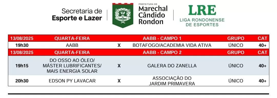 Três jogos movimentaram nesta quarta-feira (06), a 6ª rodada do Campeonato Municipal de Futebol Suíço Veterano (40+) 2025, promovido pela Secretaria de Esporte e Lazer de Marechal Rondon em parceria com a Liga Rondonense de Esportes.