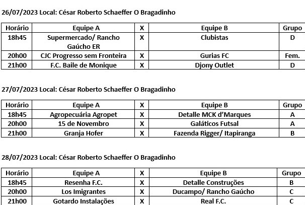 Mais seis equipes fizeram nesta terça-feira (25), no ginásio César Schaeffer O Bragadinho, suas estreias no Campeonato Municipal de Futsal de Pato Bragado, organizado pela Secretaria de Esportes e Lazer.