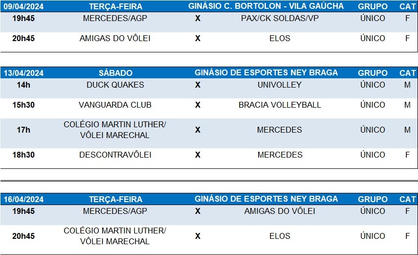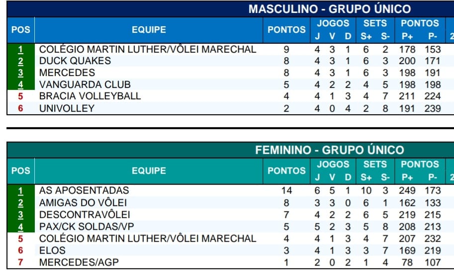 Já no Feminino, o Colégio Martin Luther/Vôlei Marechal venceu o Descontravôlei por 2 a 1, com parciais de 23/25, 25/19 e 16/14. No fechamento da rodada, as Amigas do Vôlei quebraram a invencibilidade das Aposentadas com vitória por 2 a 0, parciais de 25/15 e 25/23.