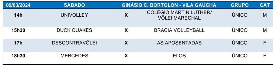 No próximo sábado (9), o Municipal de Voleibol prossegue com quatro jogos abrindo a 2ª rodada, também na Vila Gaúcha. Confira a programação: