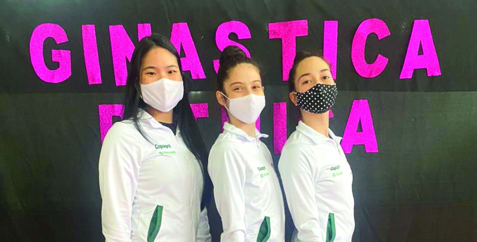 Professora Vivian Yamamoto com as ginastas Julia Gomes de Paula e Ana Clara Schaab (Foto: Divulgação/GR)