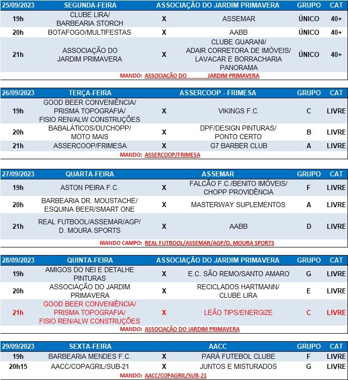 Os jogos que aconteceriam na última quarta-feira (20), na AABB, foram adiados em virtude da chuva, como forma de preservar a integridade física dos atletas e o gramado. Os mesmos já foram atualizados pela SMEL na tabela oficial da competição.
