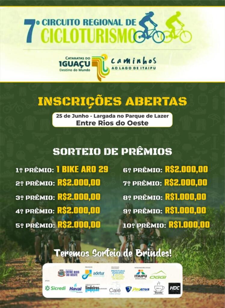 O Município de Entre Rios do Oeste sedia a 17ª etapa do 7º Circuito Regional de Cicloturismo da Região Cataratas do Iguaçu e Caminhos ao Lago de Itaipu. O evento será realizado no dia 25 de junho. Esta será a etapa final desta edição do Cicloturismo, sendo que o Circuito será retomado a partir do ano de 2024.