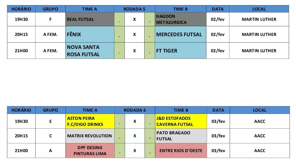Nesta semana, a Copa Sesc Verão de futsal prossegue com rodadas todos os dias, nos ginásio do Colégio Martin Luther, AACC e Vila Gaúcha. Confira a programação de hoje (2) e amanhã (3):