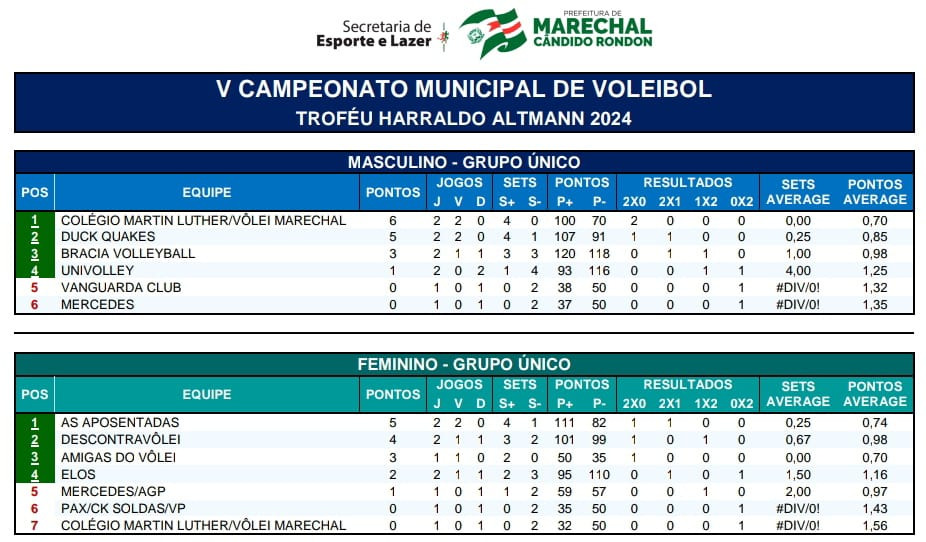 Teve sequência no último sábado (9), com a realização de quatro partidas no ginásio da Vila Gaúcha, a fase de classificação Campeonato Municipal de Voleibol 2024 – Troféu Haraldo Altmann, organizado pela Secretaria de Esporte e Lazer de Marechal Cândido Rondon.