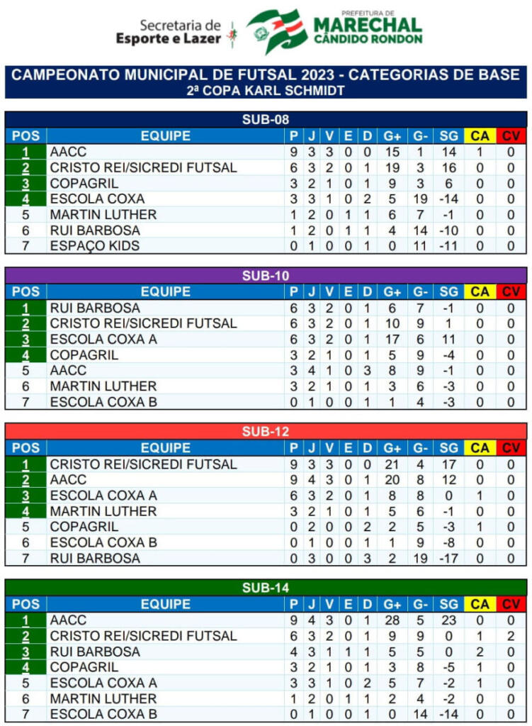 Uma excelente noite para a Escola Coxa A na 2ª Copa Karl Schmidt de Futsal Categorias Menores, competição promovida pela Secretaria de Esporte e Lazer de Marechal Cândido Rondon. Nesta quarta-feira (20), as equipes comandadas pelos técnicos Lulinha e Marcelo Martin visitaram o Colégio Martin Luther e conquistaram quatro vitórias.