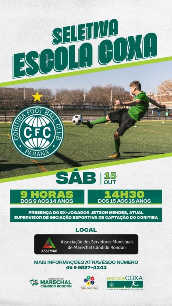 Uma grande oportunidade para os jovens que sonham ser jogador de futebol. Neste fim de semana, no campo da Assemar, em Marechal Cândido Rondon, a Escola Coxa Marechal fará uma seletiva para meninos e meninas de nove a 18 anos, com a presença do ex-jogador e supervisor de prospecção e iniciação esportiva das categorias de base do Coritiba, Jetson Mendes.