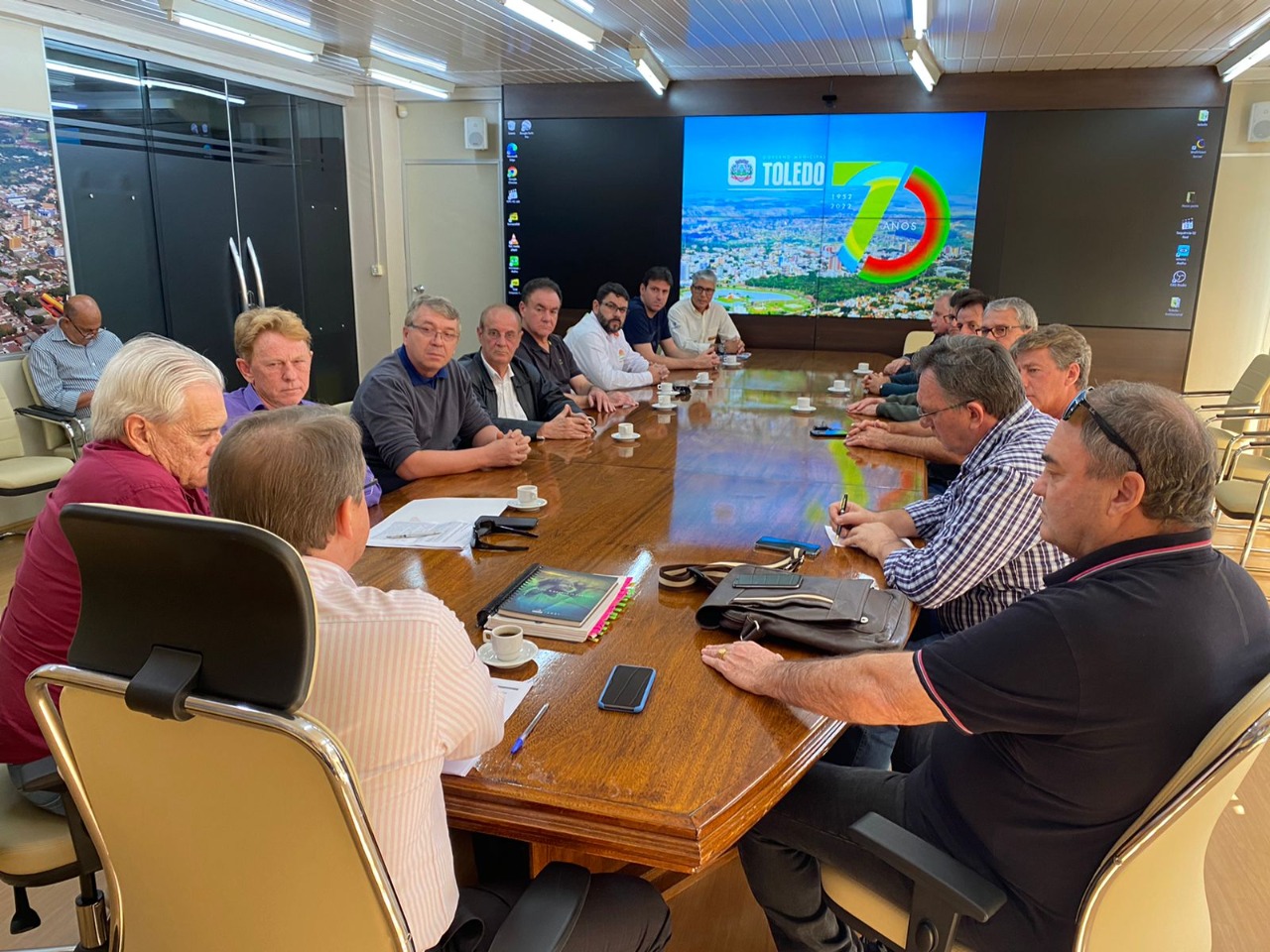 Dirigentes e conselheiros do Esporte Clube Toledo foram recebidos na tarde desta terça-feira (24), na sala de reuniões do Gabinete, pelo prefeito Beto Lunitti, avançando em tratativas em relação aos projetos do novo clube de futebol. Participaram, entre outros, o presidente do clube, Jair Benke; o presidente do Conselho Deliberativo, Wilson dos Santos; o coordenador Técnico, Agenor Piccinin; o vereador Leoclides Bisognin, presidente da Câmara Municipal e conselheiro do novo clube; o secretário de Planejamento Neuroci Frizzo; e o chefe de Gabinete Márcio “Peninha” Borges.