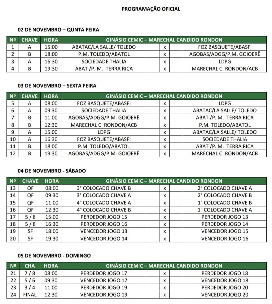 A estreia da Prefeitura de Marechal Rondon/AACC/Associação Crescendo com Basquete no Grupo B será nesta quinta-feira (2), às 19h30, contra a ABAT/ Terra Rica. Na sexta-feira (3), a equipe comandada pelo técnico Marcelo Goes faz mais dois jogos, contra a Abatol/Toledo, às 12h30, e Agobas/Goioerê, às 19h30.