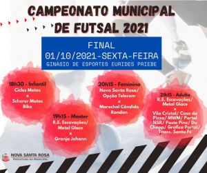 A final do Campeonato Municipal de Futsal – 2ª Copa Opção Telecom ocorre hoje (1º), em Nova Santa Rosa. A bola rola no Ginásio de Esportes Eurides Priebe, a partir das 18h30.
