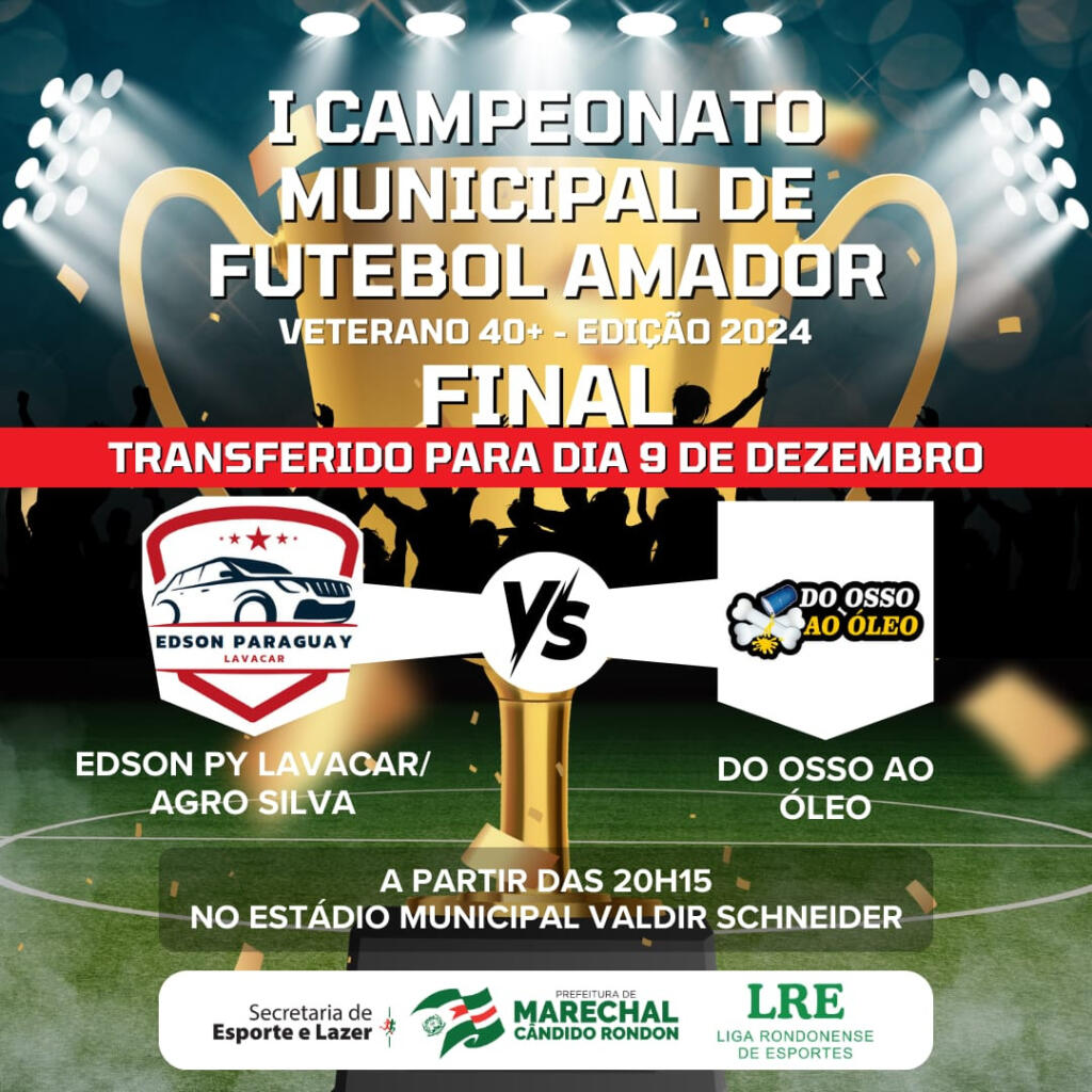 A grande decisão do 1º Campeonato Municipal de Futebol Veterano, entre Edson PY Lavacar e Do Osso ao Óleo, que estava marcada para esta sexta-feira (6), foi transferida pela organização para a próxima segunda-feira (9), às 20h15, no estádio Valdir Schneider.
