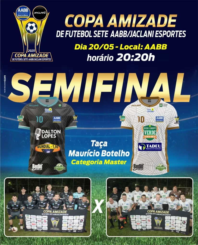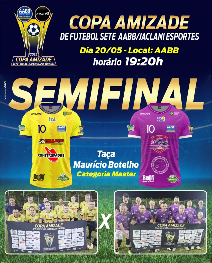 A partir das 19h20, acontecem as semifinais da categoria Máster – Taça Mauricio Botelho. Na preliminar, a Construpadre/Paulinho Motos enfrenta a Lavacar Edson PY/AgroSilva, e na sequência, às 20h20, jogam Dalton Lopes Cantor/Mundial 1,99 e Tadeu Materiais de Construção/Disk Chopp Verde.