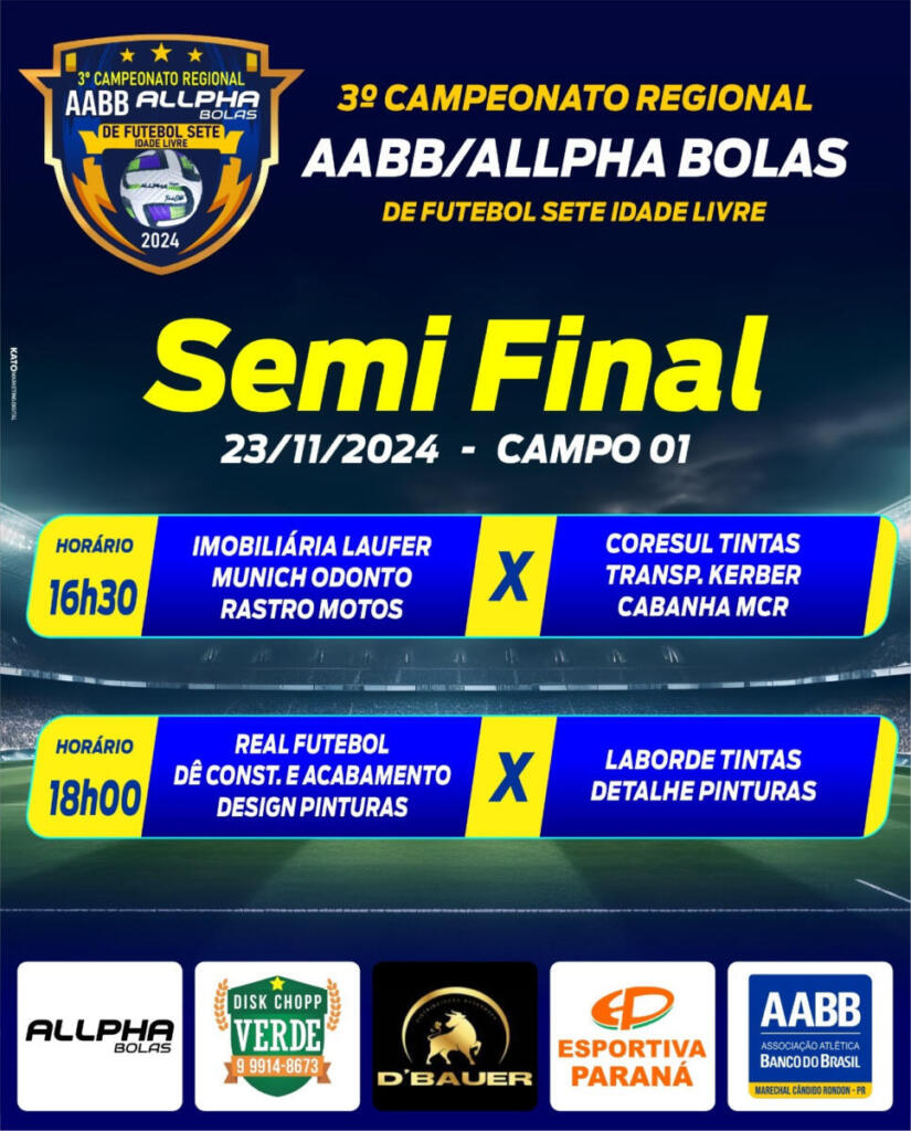 Rodada decisiva na Associação Atlética Banco do Brasil. Neste sábado (23), a partir das 16h30, acontecem as semifinais do 3º Campeonato Regional AABB/Allpha Bolas de Futebol Suíço, com a certeza de dois grandes confrontos que irão definir os finalistas da edição 2024.