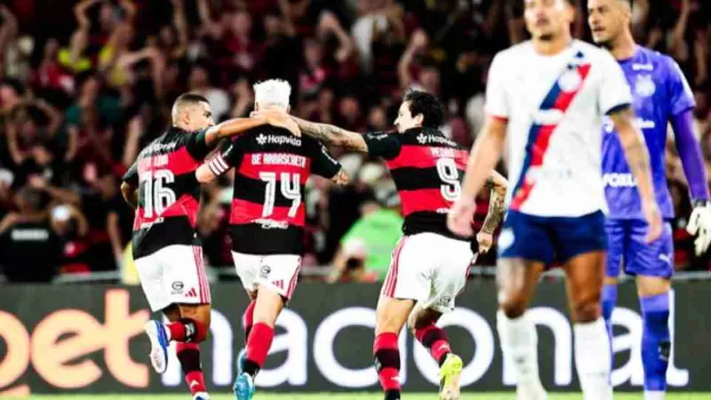 Com a casa cheia, o Flamengo não tomou conhecimento do Bahia e sufocou o adversário desde o primeiro minuto, empilhando chances de gol.