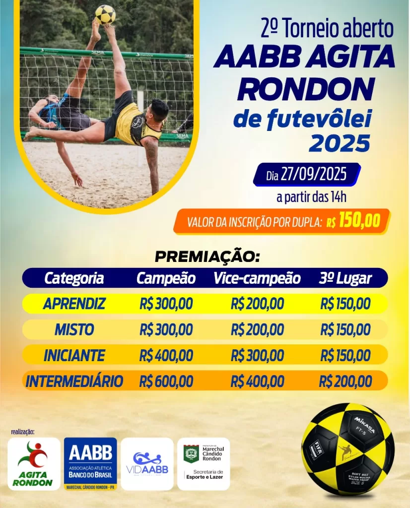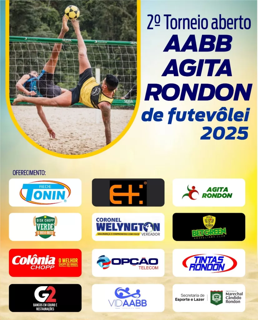 O sábado (27) será de muito esporte nas quadras de areia da Associação Atlética Banco do Brasil de Marechal Rondon, com a realização de dois eventos que integram a programação do Agita Rondon 2025, evento promovido pela prefeitura de Marechal Cândido Rondon, por meio da Secretaria de Esporte e Lazer, que tem o objetivo de incentivar a formação de cidadãos mais ativos, saudáveis e conscientes sobre a importância do lazer e da prática esportiva para o bem-estar coletivo.