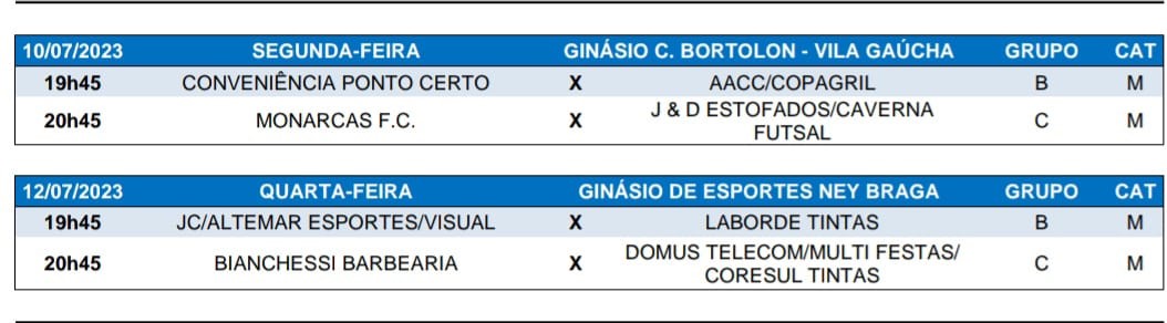 Foi encerrada nesta terça-feira (4), com a realização da 4ª rodada no ginásio Ney Braga, a segunda semana da fase de classificação do Campeonato Municipal de Futsal Masculino 2023, organizado pela Secretaria de Esportes e Lazer de Marechal Cândido Rondon.