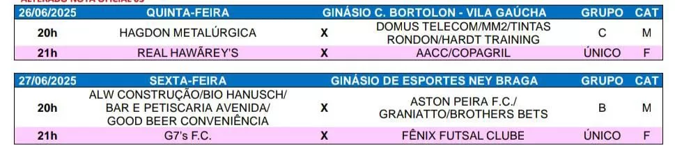 Nesta quinta (26) e sexta-feira (27), o Municipal terá mais quatro partidas, sendo duas pelo Masculino, e duas que irão abrir as disputas do Municipal Feminino. Confira a programação: