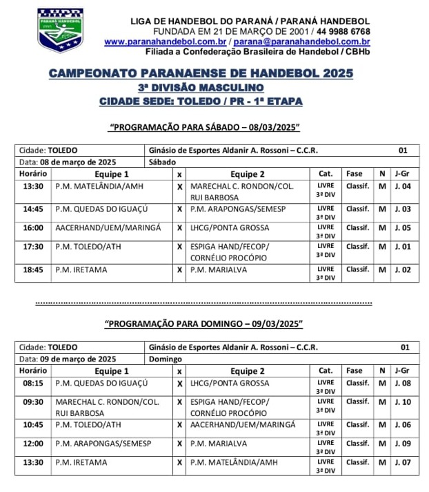 O Adulto masculino terá sua disputa pelo Paranaense “Bronze”, a competição que acontece em Toledo no ginásio do CCR terá jogos no sábado (8) e domingo (9). No sábado Marechal Rondon/Colégio Luterano Rui Barbosa entra em quadra contra Matelândia, já no domingo o adversário é Cornélio Procópio.