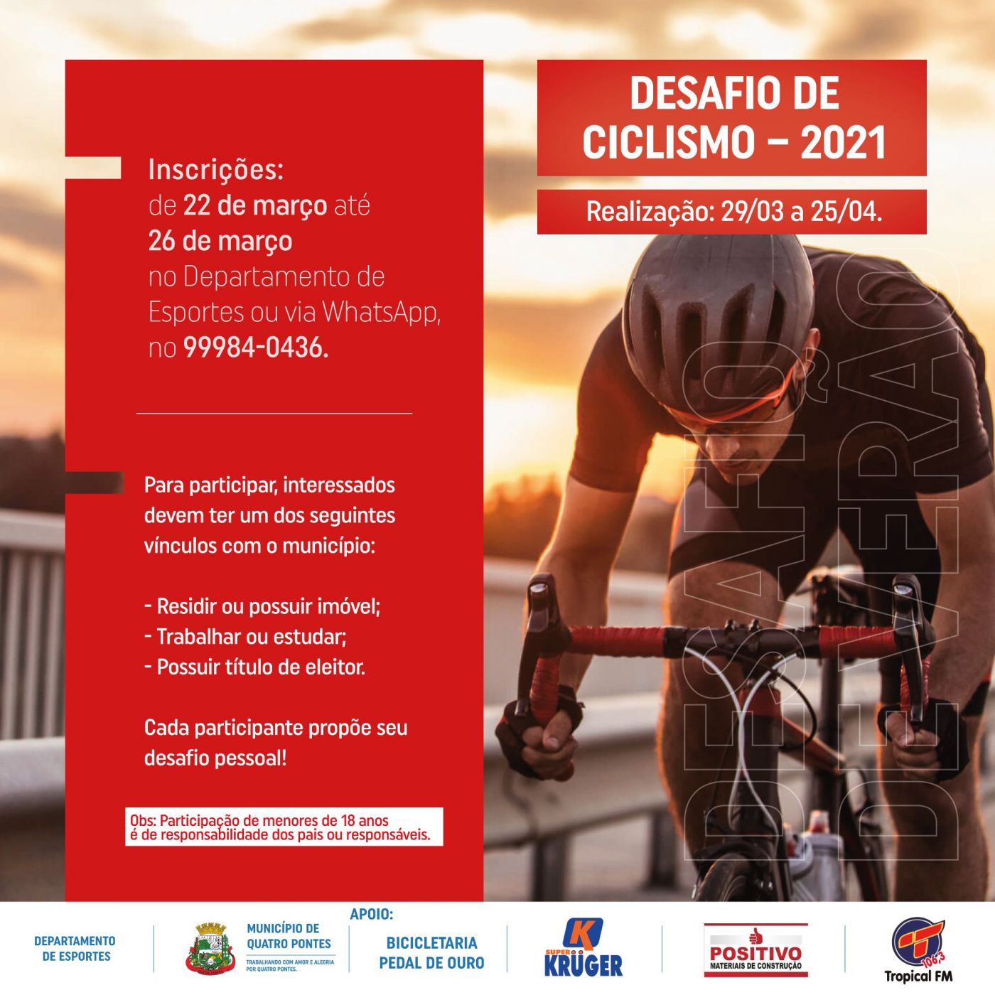 A partir desta semana, estão abertas em Quatro Pontes as inscrições ao Desafio de Ciclismo 2021, organizado pelo Departamento de Esportes. Os interessados devem se inscrever até sexta-feira (26), enviando uma mensagem via WhatsApp no 99984-0436 ou pessoalmente no departamento, com horário de atendimento das 08 ao meio-dia e das 13h30 às 17h30.