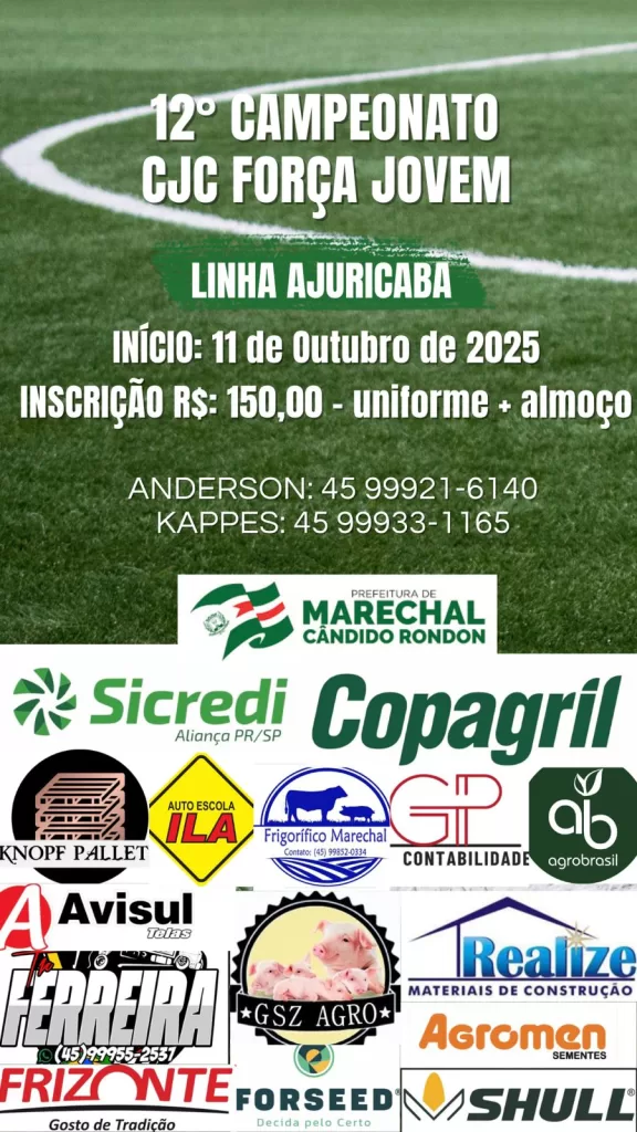 Estão abertas as inscrições para o tradicional Campeonato Integração CJC Força Jovem – Copa Sicredi/Copagril de Futebol Suíço, competição organizada pelo CJC Foça Jovem, com apoio da Secretaria de Esporte e Lazer de Marechal Cândido Rondon e Associação dos Árbitros Rondonenses (AAR), e disputada no campo da Associação de Moradores da Linha Ajuricaba.