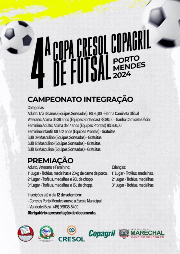 Estão abertas as inscrições para a 4ª edição da Cresol/Copagril de Futsal, competição organizada pelo Projeto Saúde Nota 10 e Escola Municipal Comandante Luis Augusto de Moraes Rego, com apoio da Secretaria de Esporte e Lazer de Marechal Cândido Rondon, que promete agitar o distrito de Porto Mendes no segundo semestre.