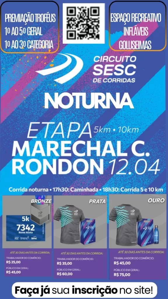 Seguem os preparativos para mais uma edição da etapa de Marechal Cândido Rondon do Circuito Sesc de Corridas e Caminhada, que acontece no dia 12 de abril. Diferente das outras edições, realizadas domingo pela manhã, desta vez o maior circuito de corridas do Brasil acontecerá no final da tarde do sábado, com largada das provas de cinco e 10 quilômetros a partir das 18h30.