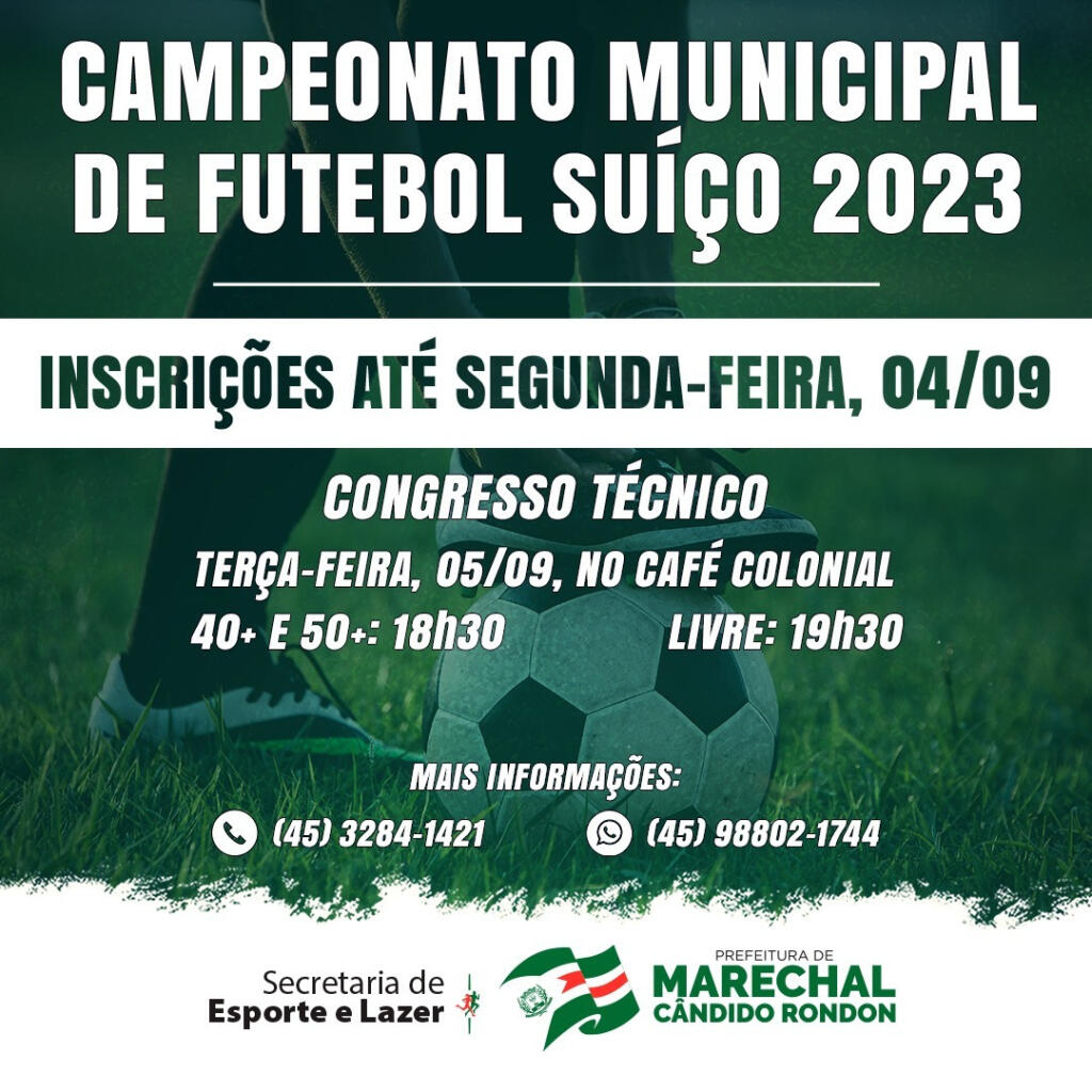 Estarão abertas até a próxima segunda-feira (4), as inscrições para o Campeonato Municipal de Futebol Suíço 2023, competição promovida pela Secretaria de Esporte e Lazer de Marechal Rondon, que mais uma vez será disputada em três categorias: Livre, Veterano (40+) e Máster (50+).