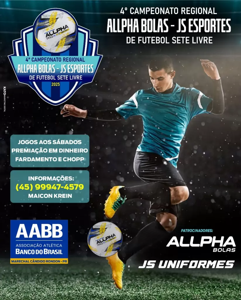 Vem aí a 4ª edição do Campeonato Regional Allpha Bolas/JS Esportes de Futebol Sete, competição promovida pela AABB de Marechal Rondon. Com limite máximo de 16 equipes, sendo que maioria das vagas já estão preenchidas, a competição tem seu prazo de inscrição até esta quarta-feira (05).
