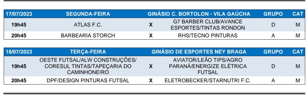 Dois jogos movimentaram nesta quinta-feira (13), no ginásio Ney Braga, a fase de classificação do Campeonato Municipal de Futsal Masculino 2023, organizado pela Secretaria de Esportes e Lazer de Marechal Rondon.