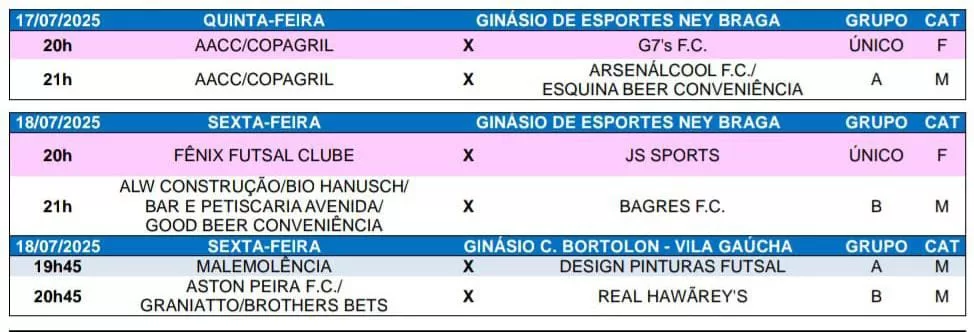 A programação do Municipal de Futsal terá sequência com dois jogos na quinta-feira (17), e mais quatro partidas na sexta-feira (18). Confira a tabela: