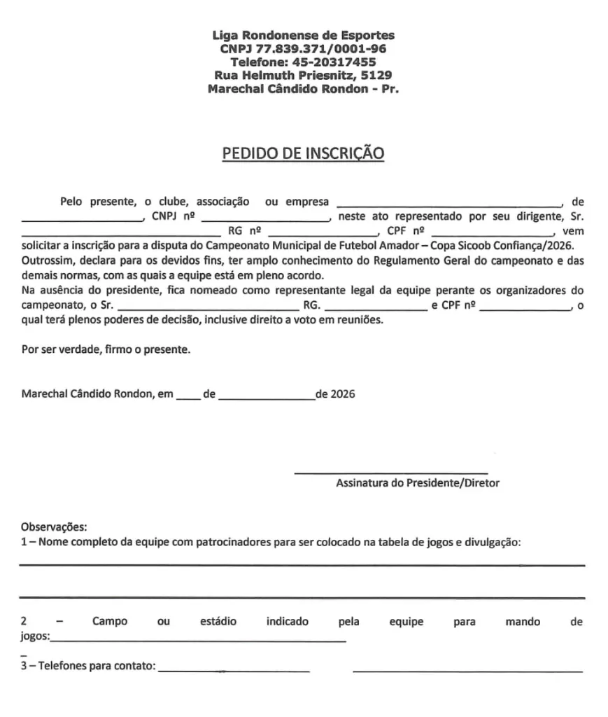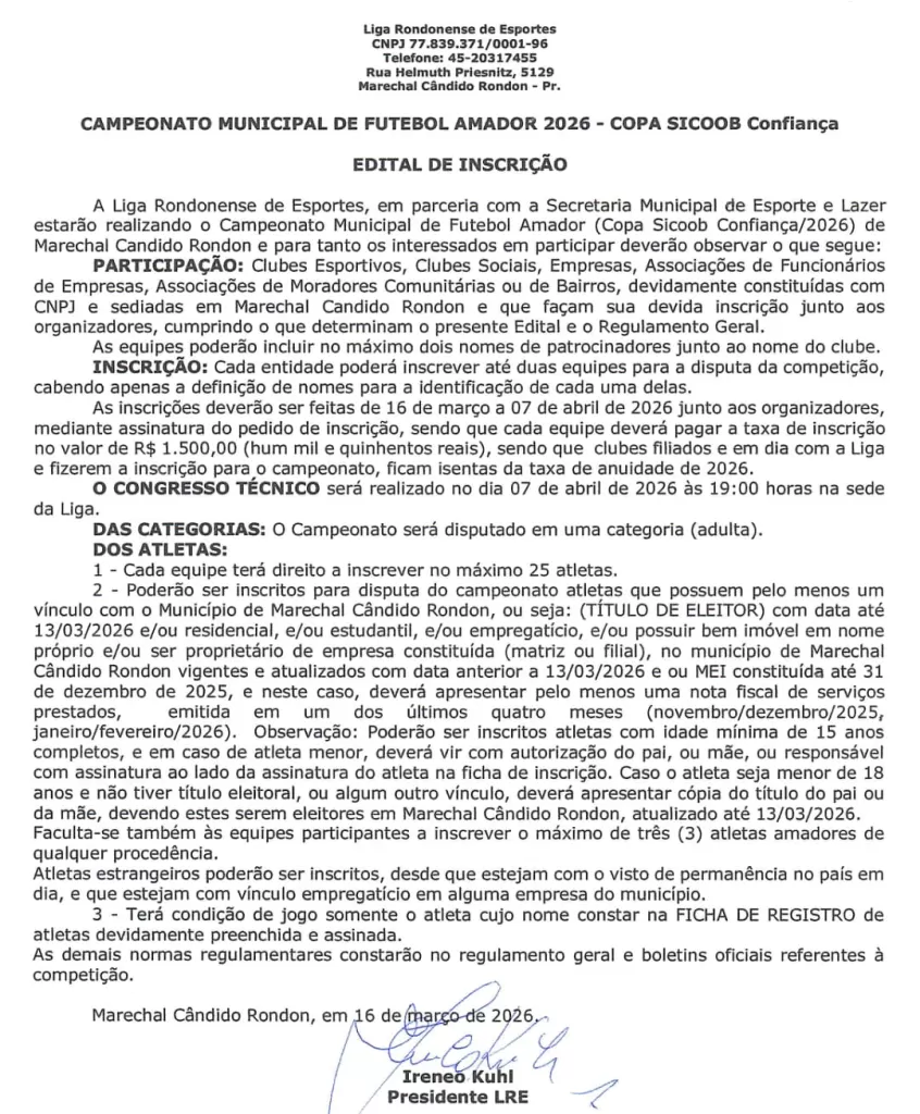 A Liga Rondonense de Esportes (LRE), através de seu presidente Ireneo Kuhl, divulgou nesta terça-feira (17) o Edital de Inscrição para o Campeonato Municipal de Futebol Amador 2026 – Copa Sicoob Confiança, competição organizada pela LRE em parceria com a Secretaria de Esporte e Lazer de Marechal Cândido Rondon.