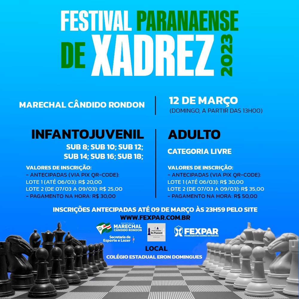 Para mais informações, basta acessar o endereço https://fexpar.com.br/festival-paranaense-de-xadrez-2023-e…/.