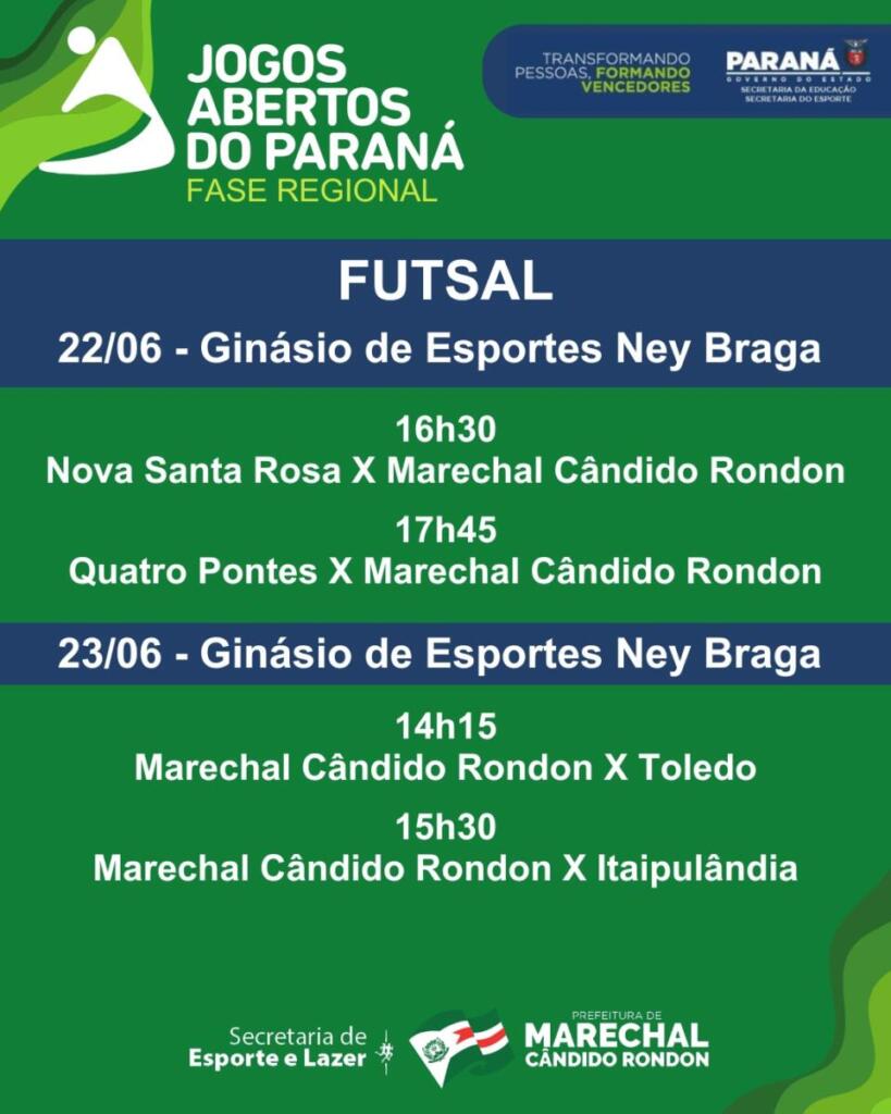Já as partidas de futsal acontecerão no Ginásio de Esportes Ney Braga. No dia 22, às 16h30, Nova Santa Rosa X Marechal Rondon (feminino); às 17h45, Quatro Pontes X Marechal Rondon (masculino). No dia 23, às 14h15, Marechal Rondon X Toledo (feminino); e às 15h30, Marechal Rondon X Itaipulândia (masculino).