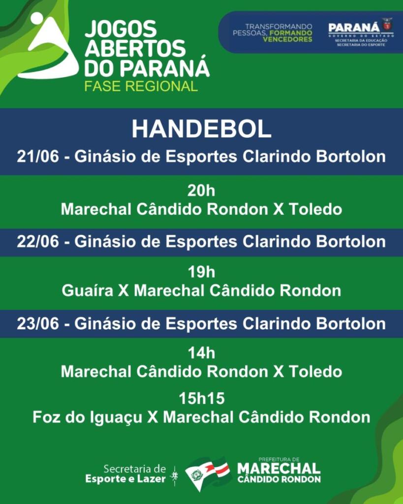 As partidas no handebol acontecerão no Ginásio de Esportes Clarindo Bortolon, na Vila Gaúcha. No dia 21, às 20 horas, Marechal Rondon X Toledo (masculino); dia 22, 19 horas, Guaíra X Marechal Rondon (feminino); e no dia 23, às 14 horas, Marechal Rondon X Toledo (feminino) e às 15h15, Foz do Iguaçu X Marechal Rondon (masculino).