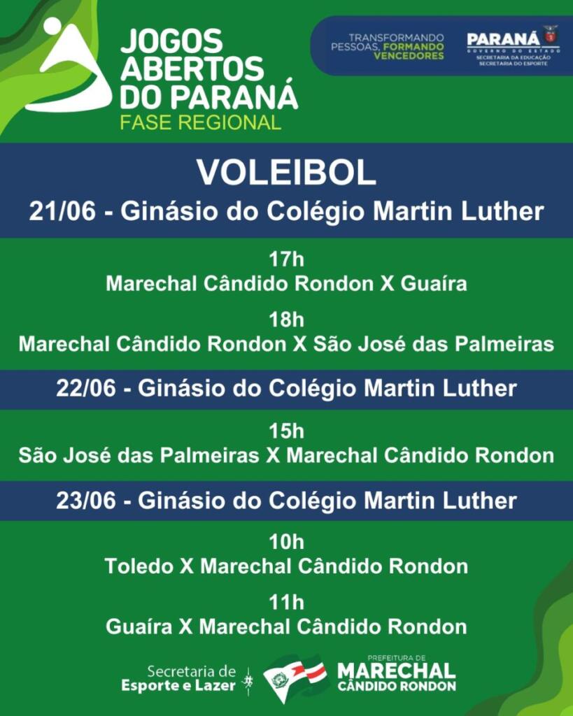 O ginásio do colégio Martin Luther será palco das partidas de voleibol. No dia 21, às 17 horas, Marechal Rondon X Guaíra (feminino); às 18 horas, Marechal Rondon X São José das Palmeiras (masculino); dia 22, às 15 horas, São José das Palmeiras X Marecha Rondon (feminino); e no dia 23, às 10 horas, Toledo X Marechal Rondon (feminino) e às 11 horas, Guaíra X Marechal Rondon (masculino).