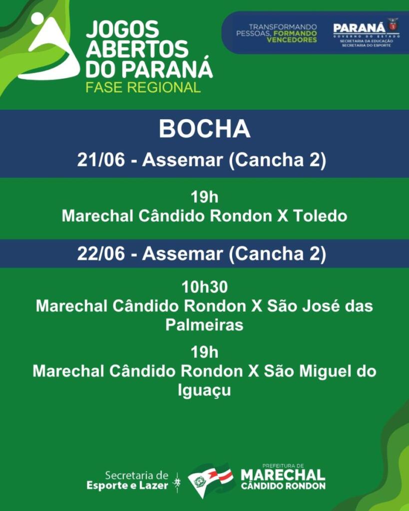 A Associação dos Servidores Públicos de Marechal Rondon (Assemar) sediará as partidas de bocha. No dia 21, às 19 horas, Marechal Rondon X Toledo (masculino) e no dia 22, às 10h30, Marechal Rondon X São José das Palmeiras (masculino); e às 19 horas, Marechal Rondon X São Miguel do Iguaçu (masculino).